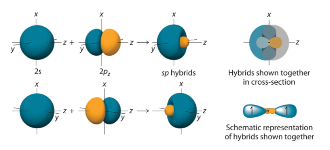 Figure The Formation of sp Hybrid Orbitals. Taking the sum and difference of an ns and an np atomic orbital where n = 2 gives two equivalent sp hybrid orbitals oriented at 180° to each other.