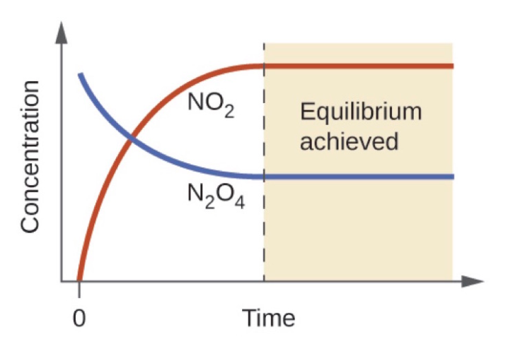 Initially, the vial contains only N2O4start text, N, end text, start subscript, 2, end subscript, start text, O, end text, start subscript, 4, end subscript, and the concentration of NO2start text, N, O, end text, start subscript, 2, end subscript is 0 M. As N2O4 gets converted to NO2start text, N, O, end text, start subscript, 2, end subscript, the concentration of start text, N, O, end text, start subscript, 2, end subscript increases up to a certain point, indicated by a dotted line in the graph to the left, and then stays constant. Similarly, the concentration of N2O4 decreases from the initial concentration until it reaches the equilibrium concentration. When the concentrations of start text, N, O, end text, start subscript, 2, end subscript and N2O4 start text, N, end text, start subscript, 2, end subscript, start text, O, end text, start subscript, 4, end subscript remain constant, the reaction has reached equilibrium.