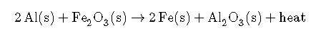 The reaction of powdered aluminum with iron(III) oxide, known as the thermite reaction, generates an enormous amount of heat—enough, in fact, to melt steel. The balanced chemical equation for the reaction is as follows:
