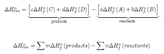 where A, B, C, and D are chemical substances and a, b, c, and d are their stoichiometric coefficients. The magnitude of is the sum of the standard enthalpies of formation of the products, each multiplied by its appropriate coefficient, minus the sum of the standard enthalpies of formation of the reactants, also multiplied by their coefficients: