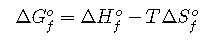 Tabulated values of standard free energies of formation allow chemists to calculate the values of ΔG° for a wide variety of chemical reactions rather than having to measure them in the laboratory. The standard free energy of formation ()of a compound is the change in free energy that occurs when 1 mol of a substance in its standard state is formed from the component elements in their standard states. By definition, the standard free energy of formation of an element in its standard state is zero at 298.15 K. One mole of Cl2 gas at 298.15 K, for example, has . The standard free energy of formation of a compound can be calculated from the standard enthalpy of formation (ΔH∘f) and the standard entropy of formation (ΔS∘f) using the definition of free energy: