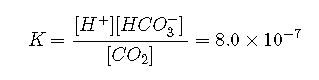 The value for the reaction is the product of the true ionization constant for carbonic acid () and the equilibrium constant (K) for the reaction of with water to give carbonic acid. The equilibrium equation for the reaction of with water to give bicarbonate and a proton is therefore