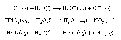 We can classify acids by the number of protons per molecule that they can give up in a reaction. Acids such as , , and that contain one ionizable hydrogen atom in each molecule are called monoprotic acids. Their reactions with water are: