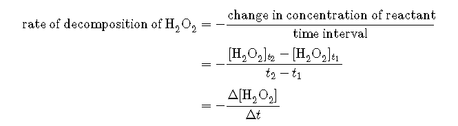 For reactants and products in solution, their relative amounts (concentrations) are conveniently used for purposes of expressing reaction rates. If we measure the concentration of hydrogen peroxide, H2O2, in an aqueous solution, we find that it changes slowly over time as the H2O2 decomposes, according to the equation: