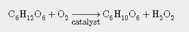 Equation depicts the oxidation of glucose in the urine to yield glucolactone and hydrogen peroxide. The hydrogen peroxide produced subsequently oxidizes colorless iodide ion to yield brown iodine, which may be visually detected. Some strips include an additional substance that reacts with iodine to produce a more distinct color change.