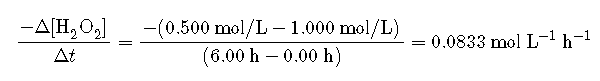 represents the molar concentration of hydrogen peroxide at some time t1; likewise, represents the molar concentration of hydrogen peroxide at a later time t2; and Δ[H2O2] represents the change in molar concentration of hydrogen peroxide during the time interval Δt (that is, t2 − t1). Since the reactant concentration decreases as the reaction proceeds, Δ[H2O2] is a negative quantity; we place a negative sign in front of the expression because reaction rates are, by convention, positive quantities. Figure provides an example of data collected during the decomposition of H2O2.