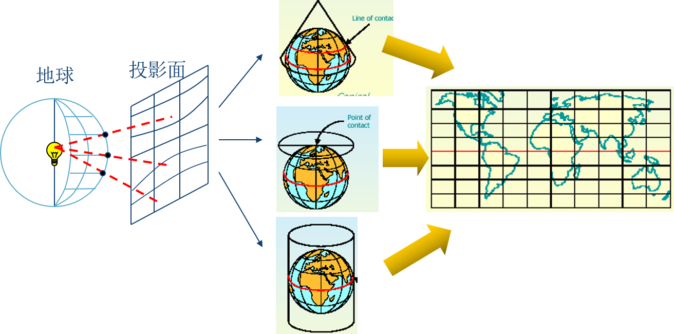 根据投影面与地球自转轴间的方位关系,几何投影又可划分为:正轴投影、横轴投影、斜轴投影。而根据投影面与地球的位置关系,几何投影又可划分为:割投影和切投影。