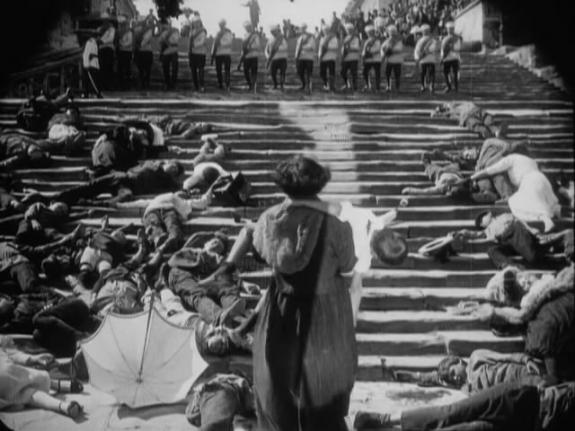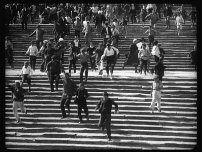 最令人难以忘怀,也是被世界电影工作者倍加赞誉、评述最多的段落是影片的第四段落“敖德萨阶梯”。在这一段落中,各种形式的冲突与蒙太奇方法达到炉火纯青的程度:人体运动与机械运动;混乱的运动(人群)与有秩序的运动(士兵),向下的运动与向上的运动;全景的运动与特写的运动此起彼伏,一浪高过—浪。为了突出沙皇军队的残忍和血腥的屠杀,爱森斯坦有意将集体动作时间进行了延时性剪辑,从2分钟延长至10分钟。在事件的描述中,不断插入细节描写与重复性剪辑,灭绝人性的沙皇士兵、怀抱婴儿的勇敢妇女、倒在血泊中的孤弱群众以及那只滑落的婴儿车深深地铭记在人们的心中。爱森斯坦打破了逻辑,扩展了时间,选用了无数“刺激人的瞬间”实现了他的“杂耍蒙太奇”的思想,为世界银幕留下了部经典作品。