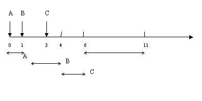 · Example: There are three batch jobs A through C, and their arrival time and running time are as follows. If use FCFS algorithm, what is the scheduling order? Please compute the turnaround time of every job and the mean turnaround time.