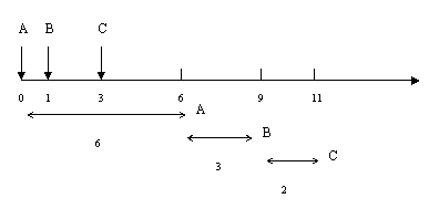 · 3.the scheduling order of SRN algorithm: A(1)→B→C→A(5), so
