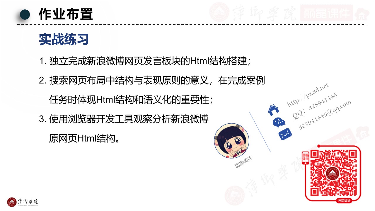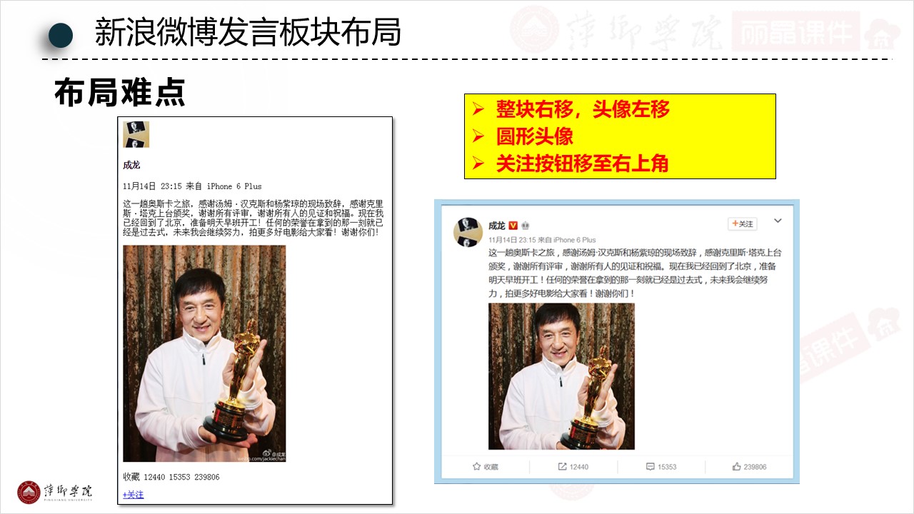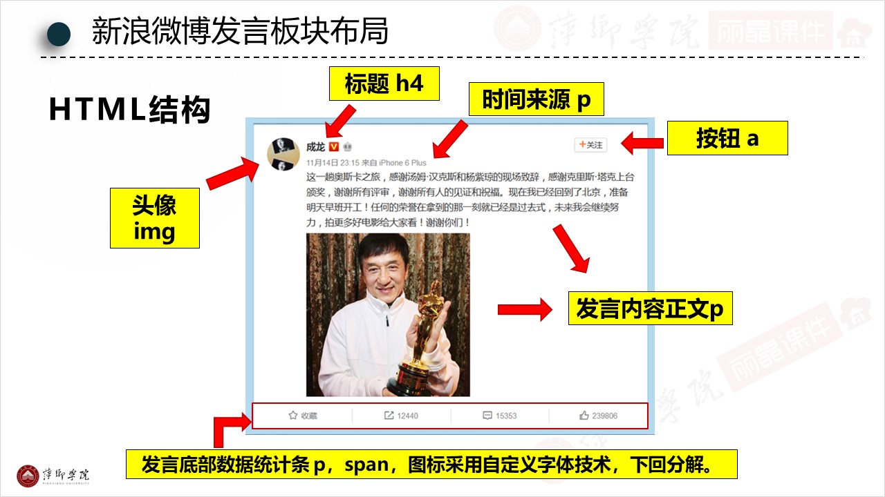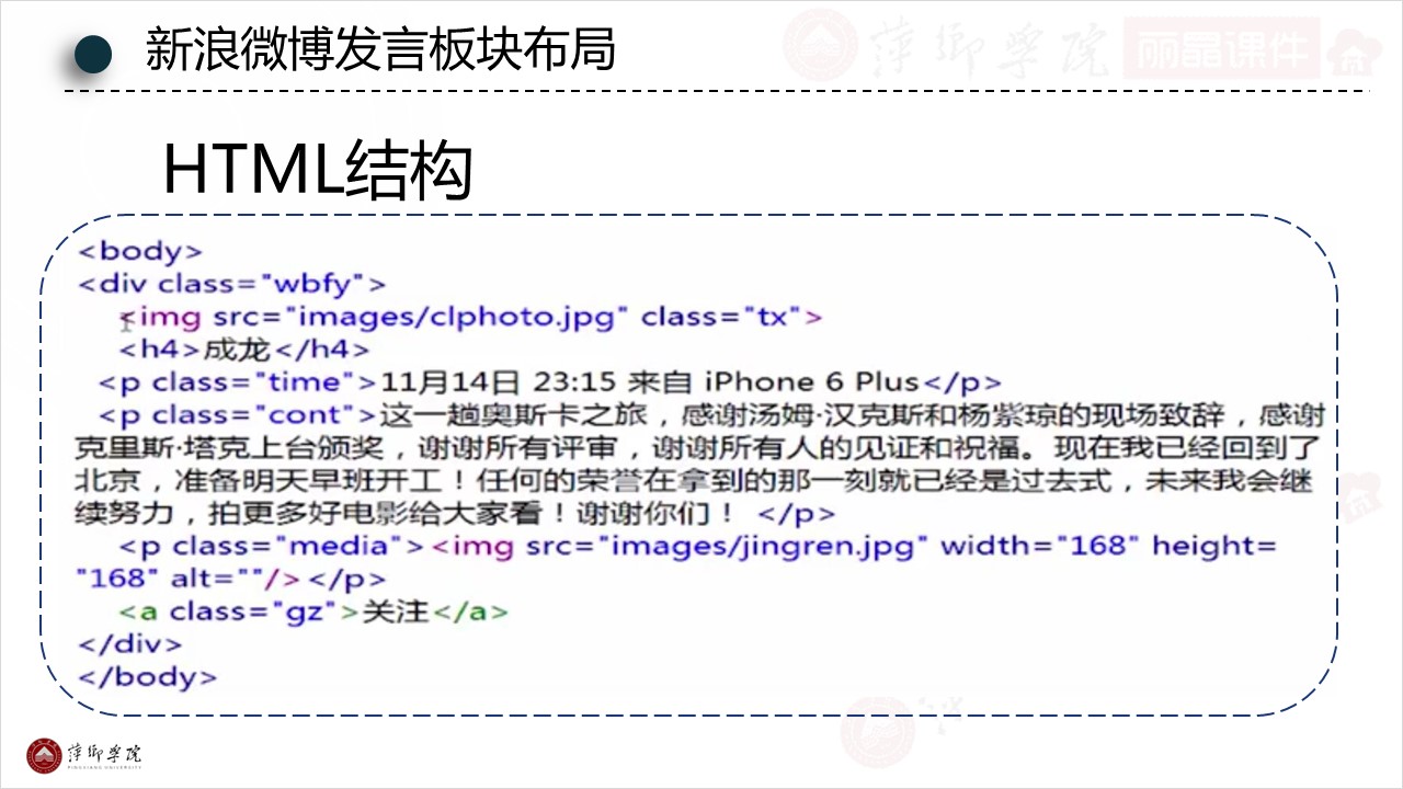 同学们好,这节课我们将进行网页布局实战练习,我们将以仿新浪微博发言版块布局为例,本课时我们先来研究如何搭建仿新浪微博发言版块布局案例的Html结构。准备好了吗,我们开讲了!