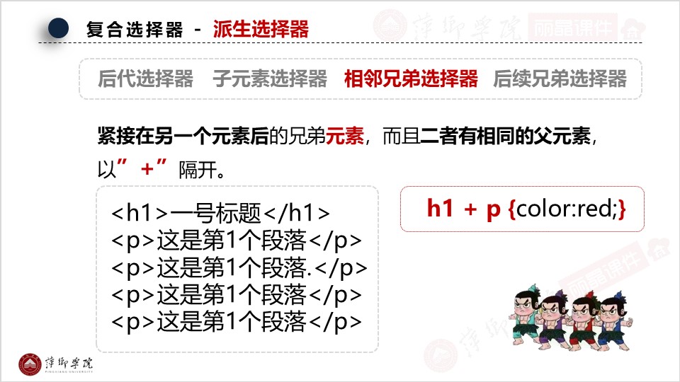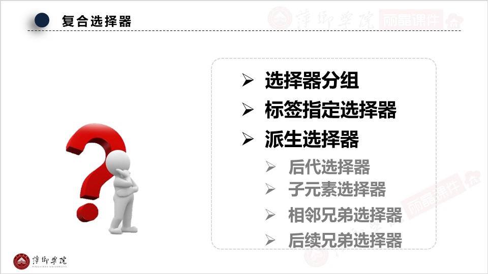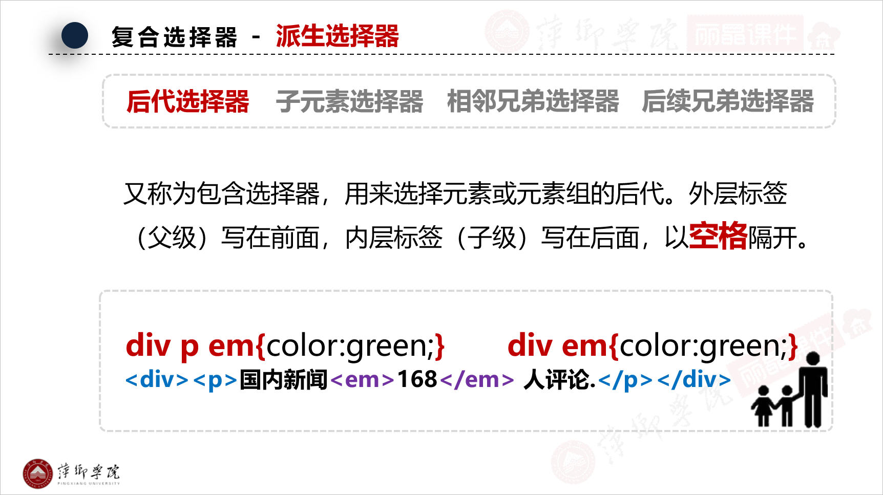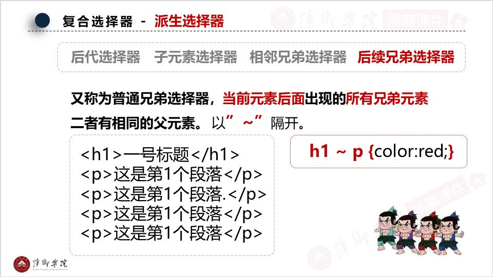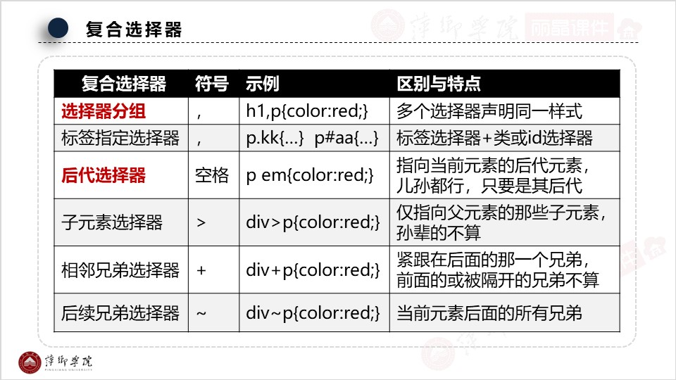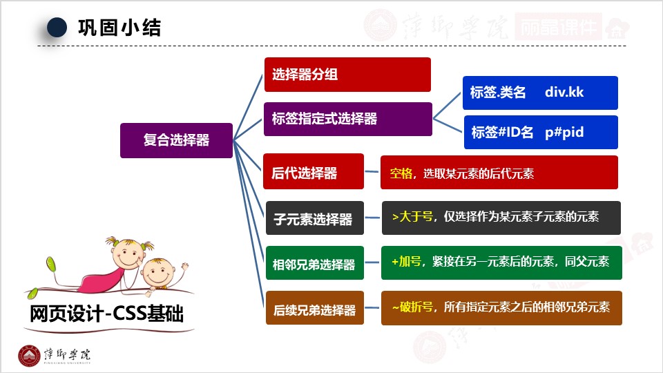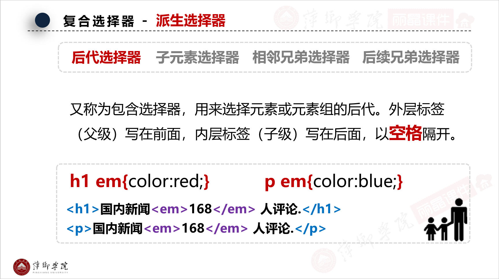 同学们好,这节课我们学习CSS选择器分组、标签指定选择器以及后代选择器、子元素选择器、相邻兄弟选择器和后续兄弟选择器,这些复合选择器比上节课讲的基础选择器稍微复杂一些,我们要仔细了解各类选择器的特点。本节的重点是掌握选择器分组和后代选择器的使用,其他几类选择器我们在后续学习实践过程中也会逐渐熟悉,另外本节课我们还介绍了CSS的层叠性、继承性和优先级,这些内容也需要我们在今后的学习实践过程中慢慢体会逐步理解和掌握。准备好了吗,我们开讲了!