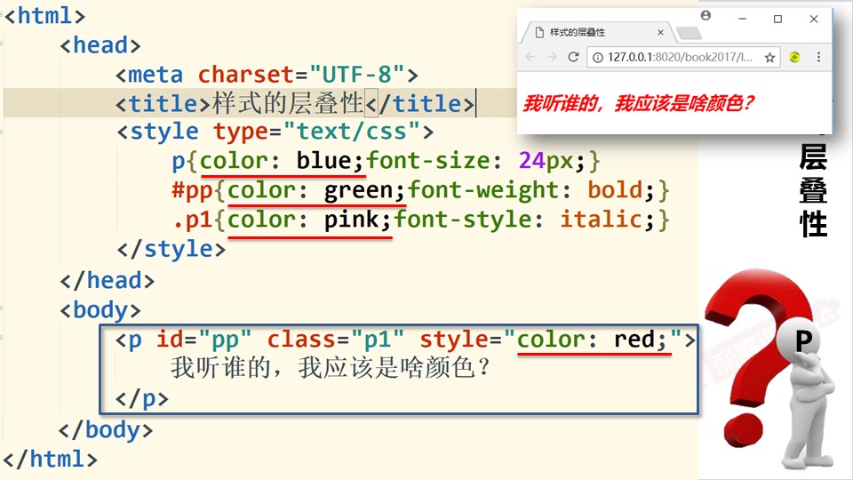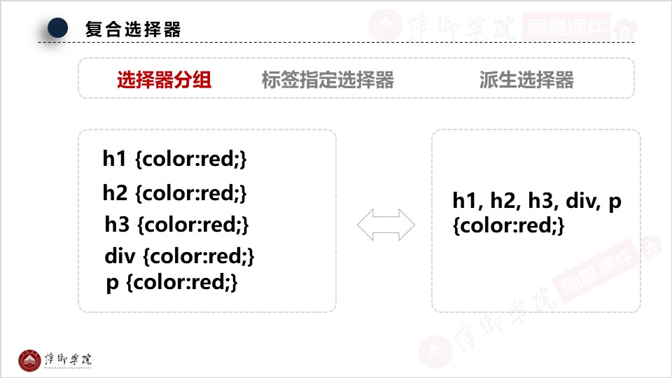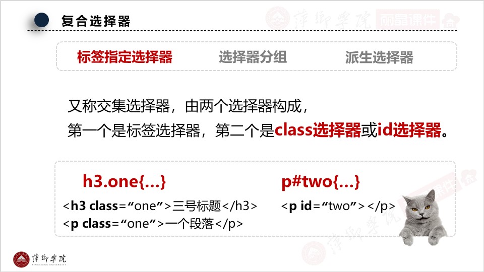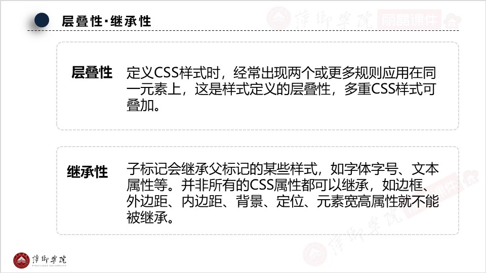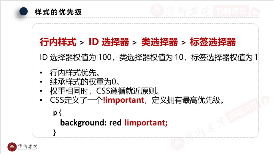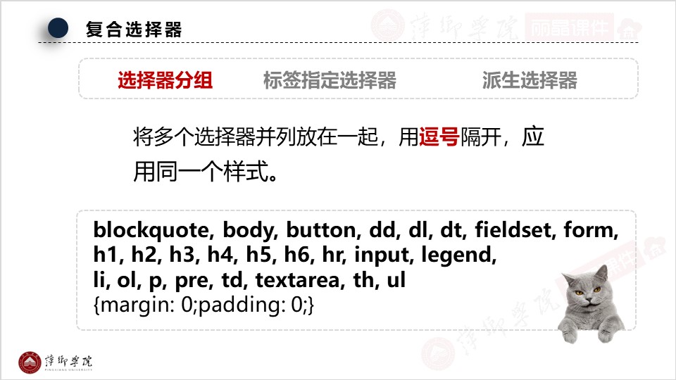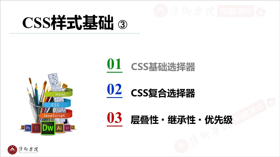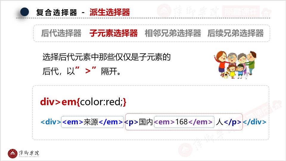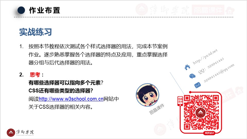 同学们好,这节课我们学习CSS选择器分组、标签指定选择器以及后代选择器、子元素选择器、相邻兄弟选择器和后续兄弟选择器,这些复合选择器比上节课讲的基础选择器稍微复杂一些,我们要仔细了解各类选择器的特点。本节的重点是掌握选择器分组和后代选择器的使用,其他几类选择器我们在后续学习实践过程中也会逐渐熟悉,另外本节课我们还介绍了CSS的层叠性、继承性和优先级,这些内容也需要我们在今后的学习实践过程中慢慢体会逐步理解和掌握。准备好了吗,我们开讲了!
