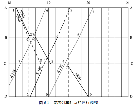如图6-3所示,l1005次图定在18:50到达C站停会11006次,但因l1005次列车晚点40 min,此时可将会车地点由C站改为B站,这样就保证了11006次列车的正点运行。