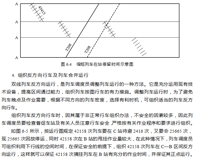如图6-4所示,按运行图计划规定45415次摘挂列车在B站作业并等会T208次旅客列车,在C站也要进行甩挂作业。现因T208次列车晚点,若仍按图定计划在A站等会T208次列车,就会大大延长45415次列车在B站的停留时间,造成该列车晚点。此时为了保证45415次列车的正点运行,列车调度员应有预见性地组织B站采取各种措施(如提前准备好待挂车辆,尽可能进行平行作业等)抓紧45415次列车的作业,压缩其在B站的作业停留时间,提前开到C站等会T208次。这样既保证了45415次在C站的正常作业时间,也使其能按图定时间正点到达终点。
