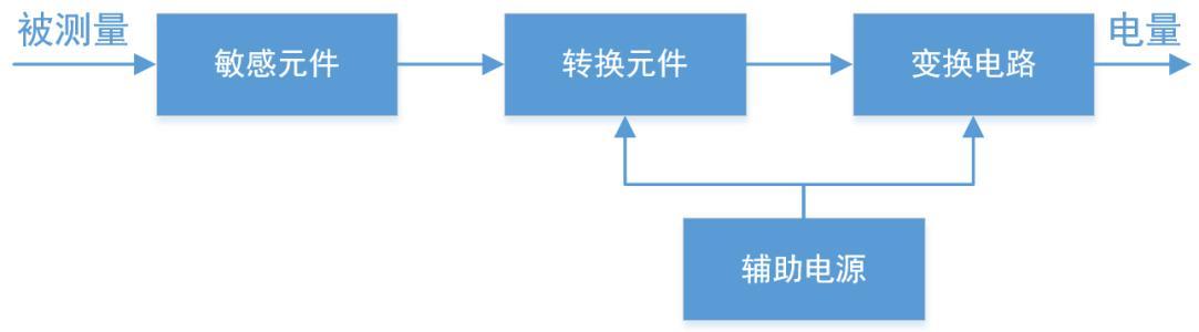 传感器一般由敏感元件、转换元件、变换电路和辅助电源四部分组成,如图下图所示。