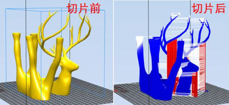 什么是切片呢?切片实际上利用3d打印的处理软件将3D模型在某一个方向(一般会根据材料加工方式和零件大小选择高度最低的方向)切成一片一片的,获得每个截面的轮廓,然后软件设计好打印的路径(填充密度,角度,支持等),在软件中还会自动帮你修复非常薄的界面,并在截面处加上支持。切片后的将打印需要扫描的路径储存成.gcode格式,这是一种3D打印机能直接读取并使用的文件格式,它能控制打印机的运动、3D打印机打印材料喷出的多少等等参数。