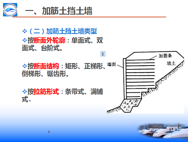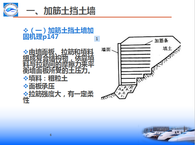 加筋土挡土墙是一种用加筋土技术修建的轻型支挡结构,是由墙面系、拉筋和填土共同组成的挡土结构。它依靠填料与拉筋之间的摩擦力作用,平衡填料作用于墙面上的水平土压力,使之形成整体,抵抗其后部填料产生的土压力。
