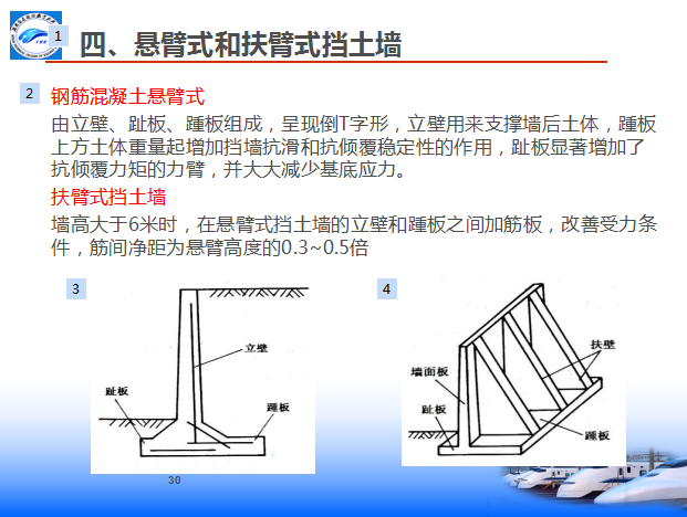 悬臂式挡土墙它由墙面板(立壁)和墙底板(包括墙趾板和墙踵板)组成,呈倒“T”字形,具有三个悬臂,即立壁、墙趾板和墙踵板。扶壁式挡土墙由墙面板(立壁)、墙趾板、墙踵板及扶肋(扶壁)组成。扶肋把立壁同墙踵板连接起来,起加劲的作用,以改善墙面板和墙踵板的受力条件,提高结构的刚度和整体性,减小墙面板的变形。