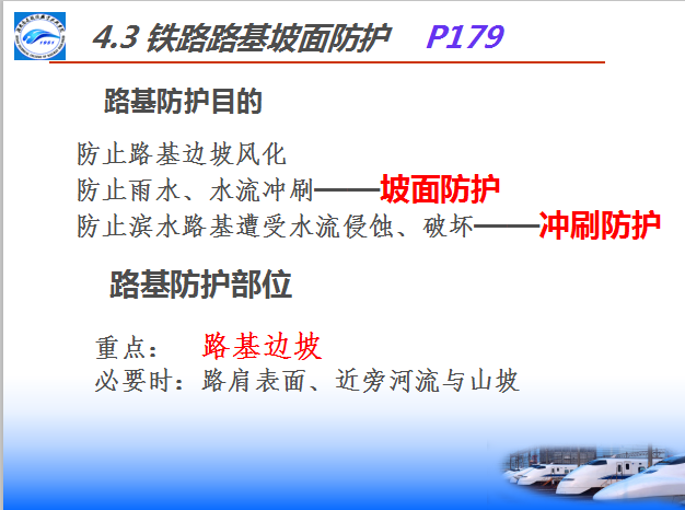 由岩土修筑的路基,长期遭受各种自然因素(如雨、雪、日晒、冲刷等)的强烈作用,在这种不利的水、温条件下,岩土的物理力学性质常发生较大变化,强度降低;也可导致强度的衰减和剥蚀;雨水冲刷和地下水浸入,易造成和加剧路基的水毁病害。路基防护是保证路基强度和稳定性的重要措施之一,其防护的重点是路基边坡,必要时也包括路肩表面,以及近旁河流与山坡。