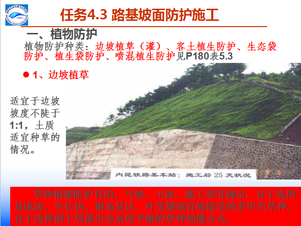 植物防护是对路基坡面采取种植植物或种植植物与工程防护(土工合成材料、浆砌片石骨架、混凝土框格、坡角矮挡墙等)相结合的边坡坡面防护措施。具有防护效果好,又能改善和美化环境,是一种绿色防护技术。