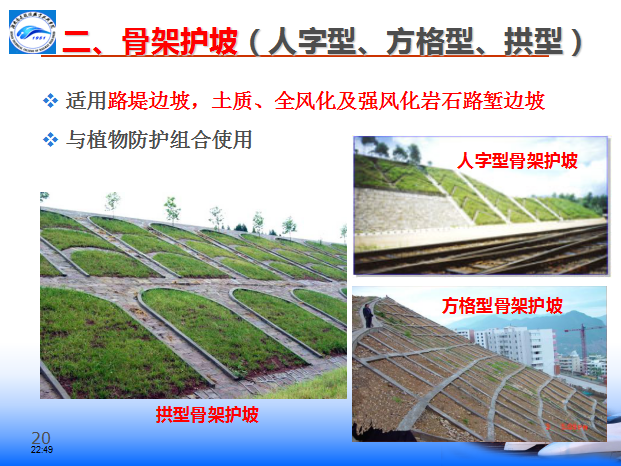 浆砌片石或混凝土骨架的常用结构形式有方格型、人字型、拱型等。