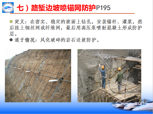 喷浆防护适用于易风化但未遭强风化、全风化,坡率不陡于1︰0.5的岩石堑坡。