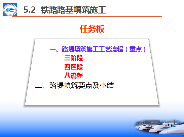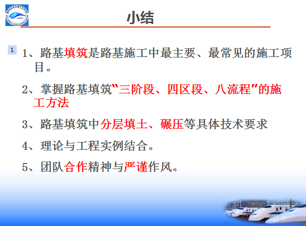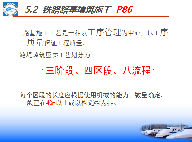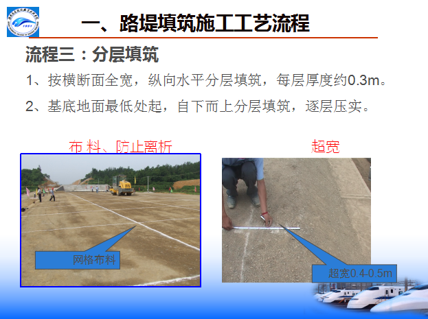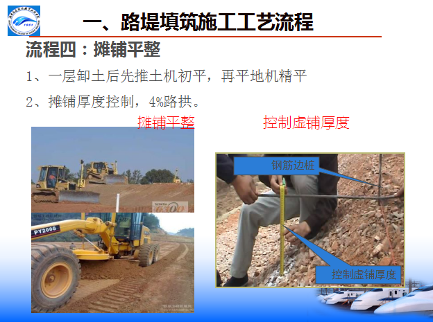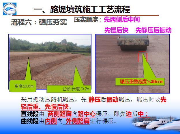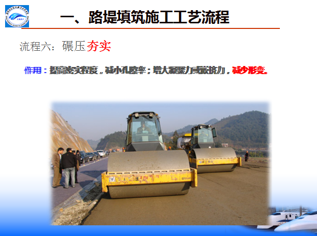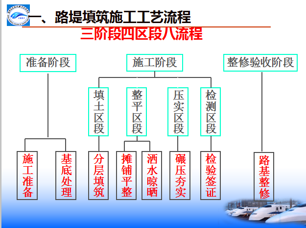 八流程:施工准备—基底处理—分层填筑—摊铺整平—洒水(晾晒)—碾压夯实—检验签证—路基整形(边坡整修)。