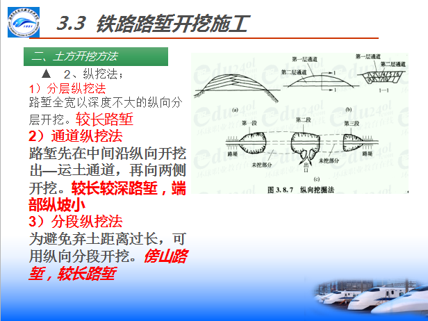 路堑开挖可按地形情况、岩层产状、断面形状、路堑长度及施工季节,并结合土方调配选用下列方式开挖:较深路堑宜分层开挖