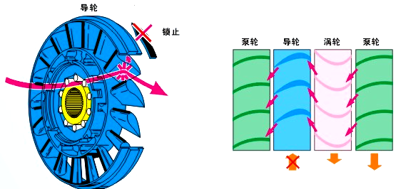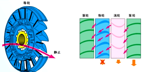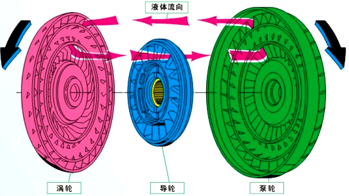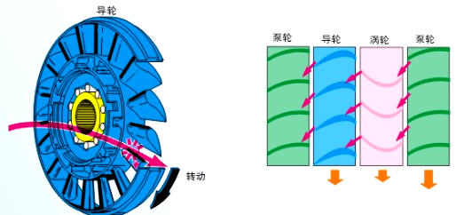 1.前面提到的液力偶合器,只有两个叶轮是不能够实现增大扭矩功能的。导轮的引入使发动机扭矩的增大成为可能。这样,液力偶合器就成了变矩器。
