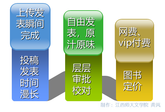 1、以互联网,手机,电子阅读器新媒体为展示平台和传播媒介
