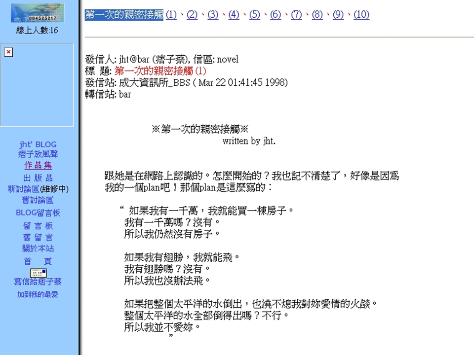 1998年3月,蔡智恒在台湾成大bbs上发表《第一次的亲密接触》。