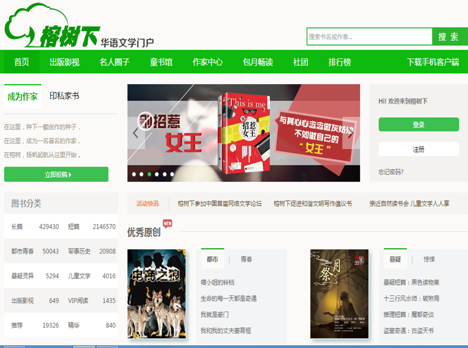 1997年我国最大的中文原创文学网站“榕树下”在上海设立。榕树下 http://www.rongshuxia.com