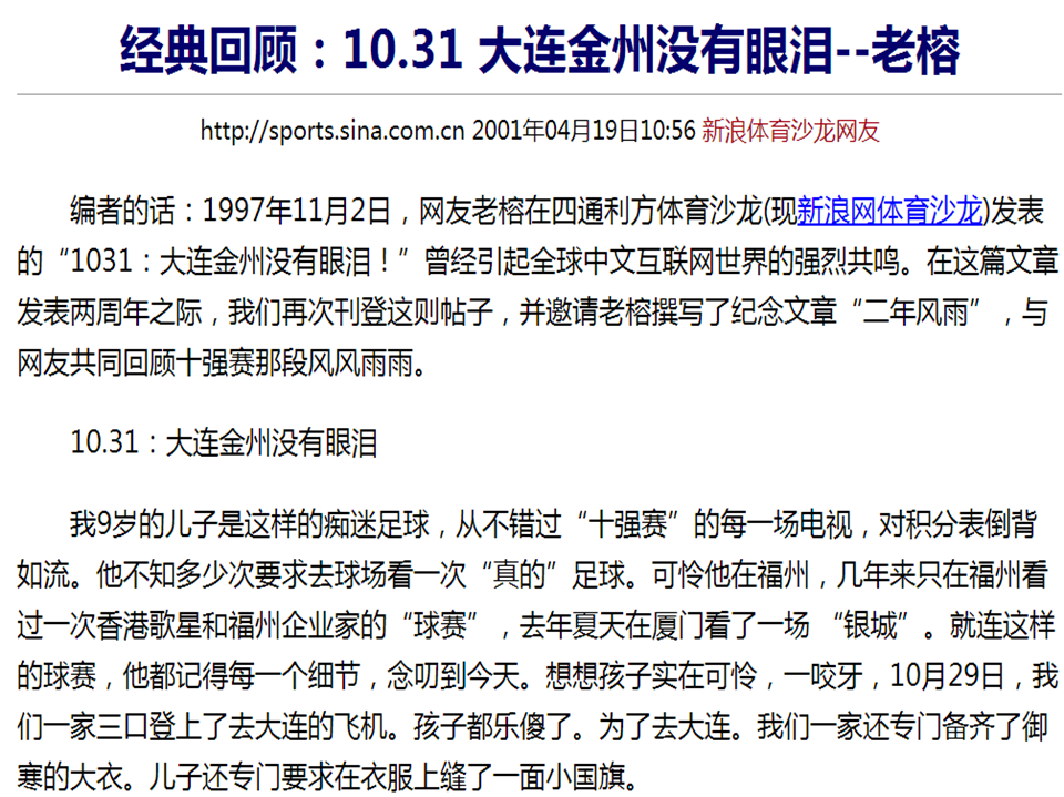 1997年11月,“老榕”发表网络散文《10.31大连金州没有眼泪》,中文网站第一次用非比寻常的速度大量转载。网络文学,第一次在内地开启了传播大幕。