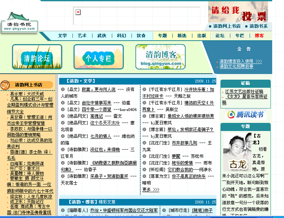 雅虎、新浪、网易、搜狐、天涯、榕树下、黄金书屋、书路、清韵等都开辟了“网络文学”版块,清韵是当时深具影响的网络文学网站。