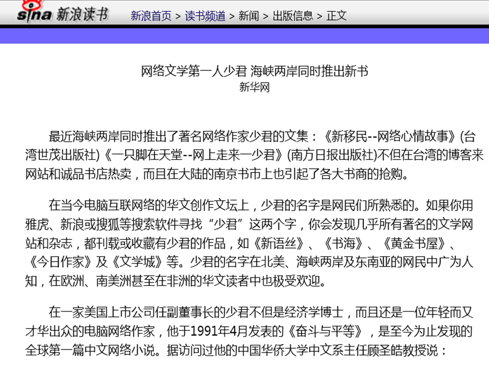 1991年4月,少君在《华夏文摘》上发表第一篇中文网络小说《奋斗与平等》。