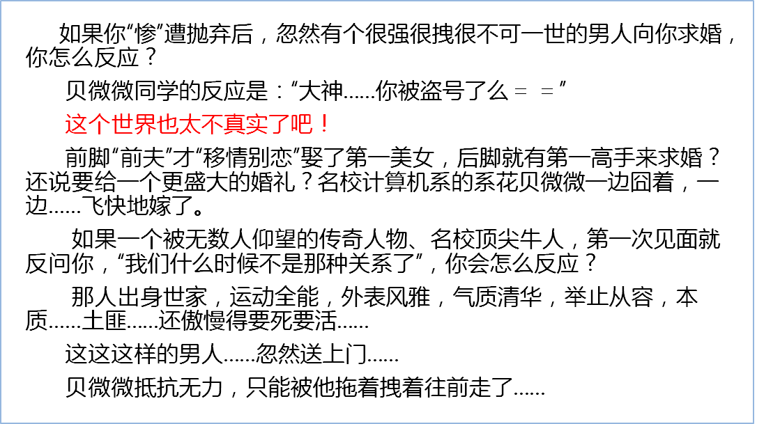 白马王子加丑小鸭再加白雪公主再加霹雳娇娃的故事情节。故事根本就没有任何冲突可言,三分之一的内容在表现女猪脚的美,三分之一的内容在炫耀男猪脚的帅,最后三分之一就是再渲染他们两个多么的幸福。整个故事就是在讲男女猪脚因为网游相识了,相遇了,相爱了,这个网游是多么的好玩。