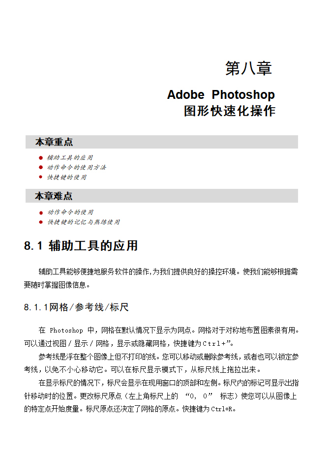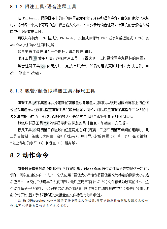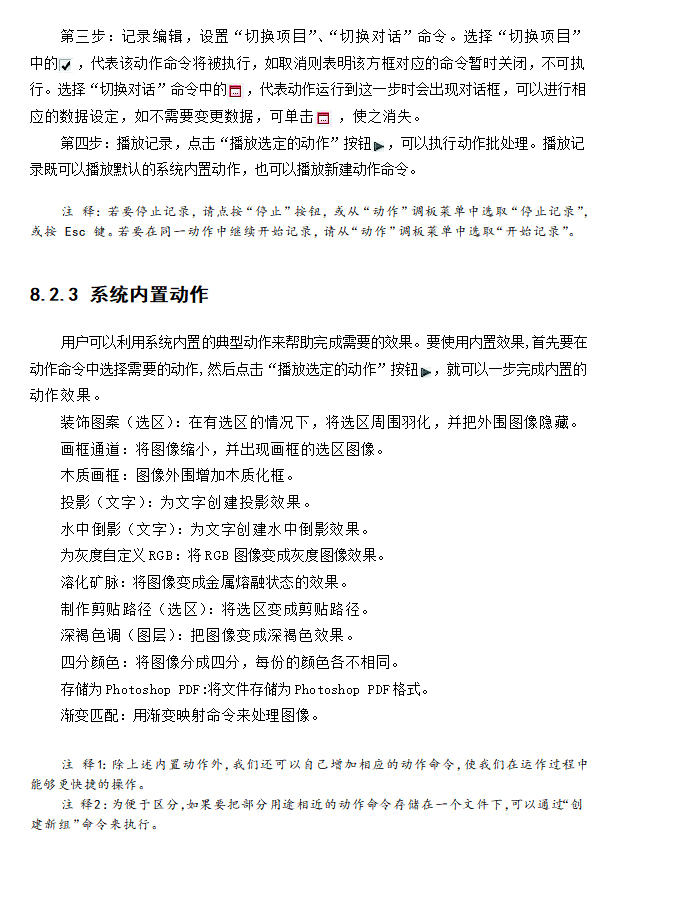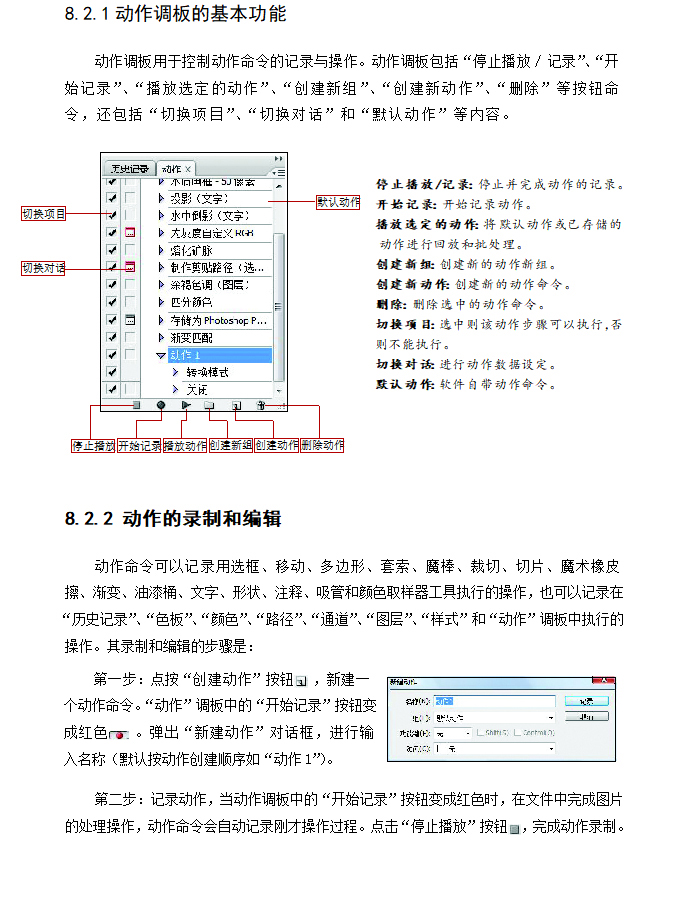动作命令是将操作步骤进行记录,然后利用这些操作步骤来对图像进行批量处理的一种快速化编辑方法。动作命令包括默认动作和新建动作两个部分,其中默认动作是软件自带的动作命令,新建动作可以由操作者自定义编辑操作。本节内容的学习重点为自定义动作命令;难点为各种动作命令的设置与调节。