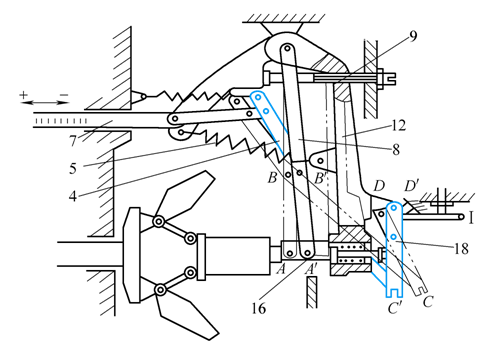 9—速度调整螺栓 12—拉力杠杆 16—滑套 18—支持杠杆