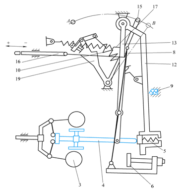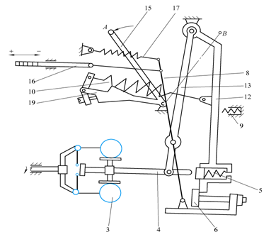 1—控制杠杆 2—滚轮 3—凸轮轴 4—浮动杠杆 5—调速弹簧 6—速度调节杠杆
