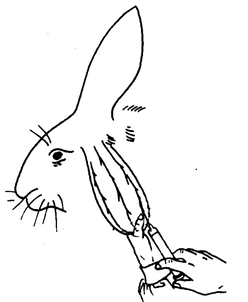 (1)耳静脉注射:将兔放置于固定器内或另一人将兔固定于胸壁之间,拔去兔耳外缘的毛,并用75%乙醇棉球涂擦该部位皮肤,使血管扩张(兔耳外缘血管为静脉),再以手指压住耳根部的静脉,阻止血液回流并使其充血。注射者以左手拇指和中指固定兔耳,食指放在耳缘下作垫,右手持注射器从静脉末端刺入血管,当针头进入血管约12.5px,即以拇指和中指将针头与兔耳固定住,同时解除静脉根部的压力。右手推动针栓开始注射,如无阻力感,并见血管立即变白,表明针头在血管内;如有阻力感并见局部组织发白,表示针头未刺入血管内,应将针头退回重刺(见实验图6)。注射完毕,压住针眼拔出针头,继续压迫片刻以免出血。注射量一般为0.2~2ml/kg。