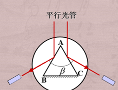 测定三棱镜顶角的方法:平行光法(反射法)。我们测量的角为两个光学面的夹角,转动游标盘,使两个游标位于分光计左右两侧(即刻度盘的游标不能位于载物台联结杆的下方,否则无法读出载物台位置的角度读数。),将三棱镜放在载物台上,待测顶角离平行光管远一些并对准平行光管,使平行光管射出的光同时投射到棱镜的两个光学面上,光线分别由AB面和AC反射。