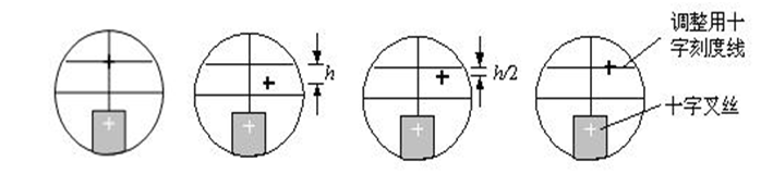 (2)由于望远镜视野很小,观察的范围有限,要从望远镜中观察到由双面反射镜反射的光线,应首先保证该反射光线能够进入望远镜,转动载物台,使望远镜的光轴垂直双面反射镜,这样双面反射镜反射的光线进入望远镜内。在望远镜内出现清晰的绿十字像,则此像的水平线一般不会与分划板上方的水平线重合。而与分划板上方的水平线有一定的高度差,如图所示。我们采用各半调节法,首先调节望远镜仰角调节螺丝,使高度差h减小一半,如图所示;再调节载物台调平螺丝b或c,使高度差全部消除,如图所示。