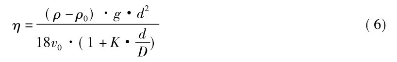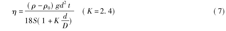 由于(1)式只适合无限广延的液体,即小球直径d远小于液柱直径D,而本实验中的小球是在直径为D的装有液体的圆柱形有机玻璃圆筒内运动,液柱面并不是无限广延的,因此必须考虑管壁对小球有影响,(5)式应修正为: