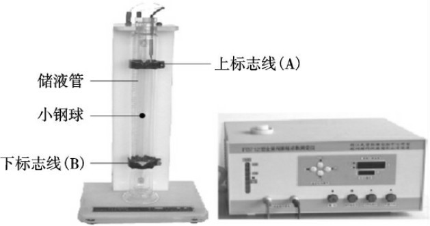 变温粘滞系数实验仪的外型如图3-54的左部所示。待测液体装在细长的储液管中,储液管外面有一层密封的玻璃空心夹层(即加热水套),储液管外的加热水套连接到温控仪,温度控制器通过循环水泵,把热水不断从玻璃夹层圆筒的底端送入,通过热循环水加热液体。使被测液体温度较快地与加热水温度达到平衡。储液管壁上有刻度线和上、下标志线,便于测量小球下落的距离。底座下设有调节螺钉,用于调节储液管的铅直。