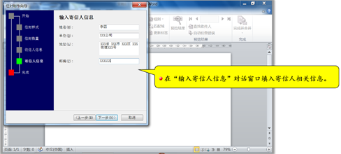 5)匹配完成后,单击【下一步】按钮,输入寄信人信息后,如图 2-6 所示;再单击【下一步】按钮,完成信封制作,将按要求生成单个的或者批量的信封。