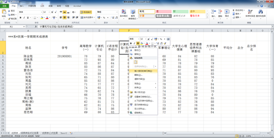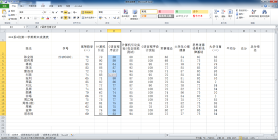 操作要求:将“C 语言程序设计”列(E2~E18)的数据移动到“计算机引论”列(D2~D18)的前面。