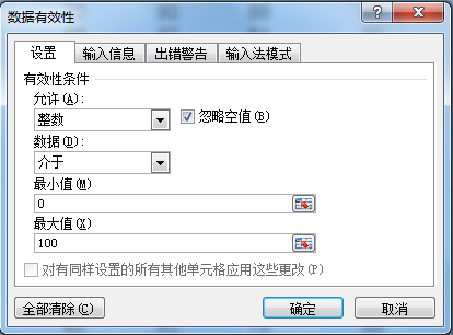 (2)在“数据有效性”对话框中,选择“设置”选项卡,如图 3‑12所示。在“允许”下拉列表中选择“整数”,在“数据”下拉列表中选择“介于”,在“最小值”文本框中输入“0”,在“最大值”文本框中输入“100。”