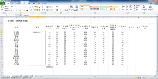 操作步骤:选中 A3 单元格,由于学号是数字形式的文字数据,输入英文标点符号状态下的单引号,再输入 201908001。