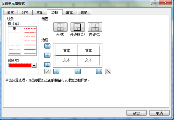 如图 3‑22所示。选择【边框】选项卡,在“线条样式”列表框中选择双线,在“颜色”下拉列表中选择“红色”,单击“预置”的【外边框】按钮。